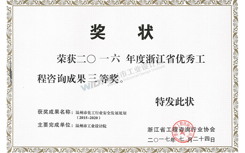 溫州市化工行業(yè)安全發(fā)展規(guī)劃 浙江省優(yōu)秀咨詢成果三等獎(jiǎng)